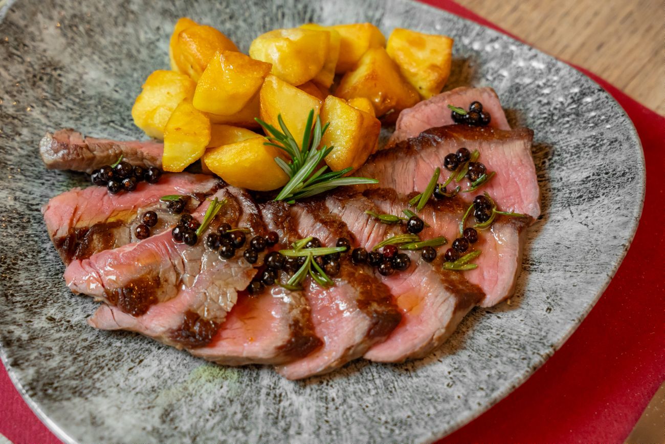 Sliced beef with extra virgin olive oil, rosemary, juniper berries and baked potatoes.