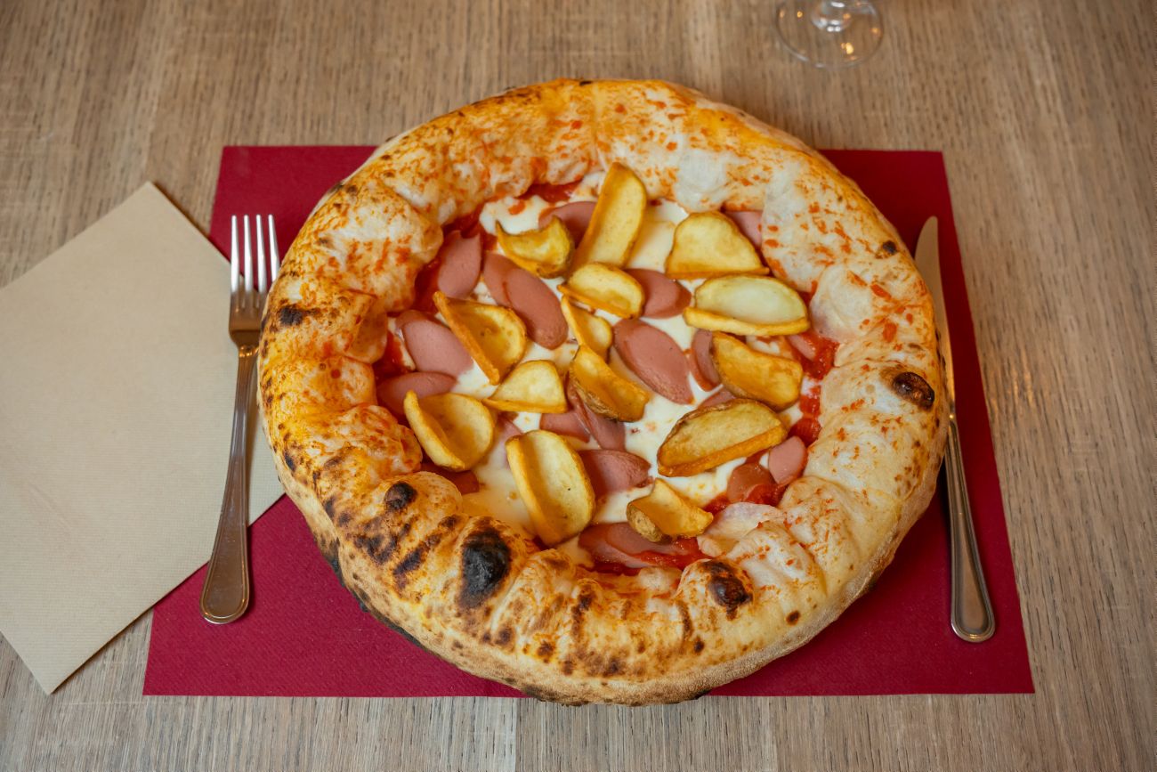 Tomato, mozzarella fiordilatte, sausage, Chips.